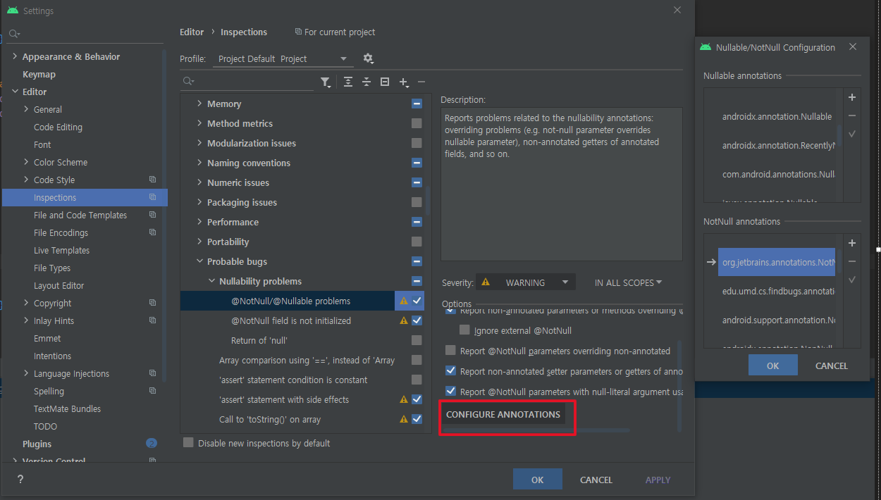 Inspections> Java> Probable bugs> Nullability problems> @ NotNull / @ Nullable problems> Configure Annotations . javax.annotation.Nullable/javax.annotation.Nonnull로 변경