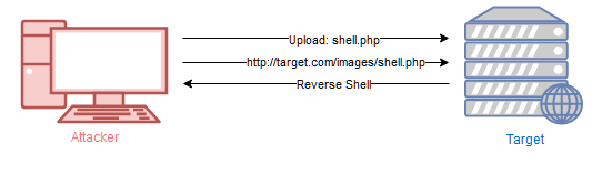다이어그램에서 먼저 쉘을 업로드한다. 그런 다음 브라우저에서 해당 항목으로 이동하여 서버가 대기 중인 수신기에 리버스 셸을 다시 보내도록 한다.