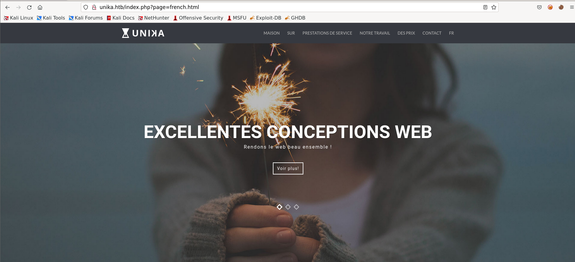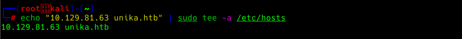 /etc/hosts ํ์ผ์ ์ด ํญ๋ชฉ์ ์ถ๊ฐํ๋ฉด ๋ธ๋ผ์ฐ์ ๊ฐ ํธ์คํธ ์ด๋ฆ unika.htb๋ฅผ ๋ค์๊ณผ ๊ฐ์ด ํ์ธํ ์ ์์ต๋๋ค.
