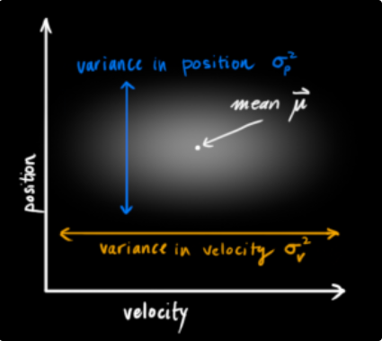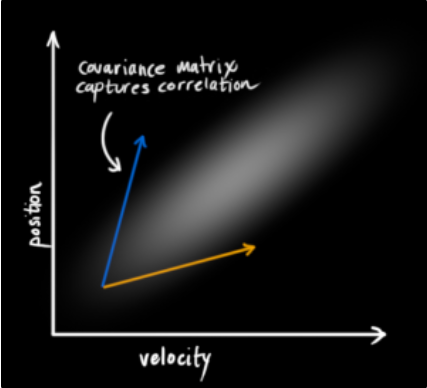 아래 그래프에서 위치와 속도는 서로 연관되어 있다. 위치는 속도에 따라 달라질 수 있다. 이는 공분산 행렬의 비대각 요소가 0이 아니라는 것을 의미한다.