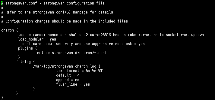 Strongswan에는 구성 단계(strongswan.conf 실행) 중에 활성화하거나 비활성화할 수 있는 많은 플러그인이 있다. 컴파일 후 플러그인은 동적으로 로드된다.