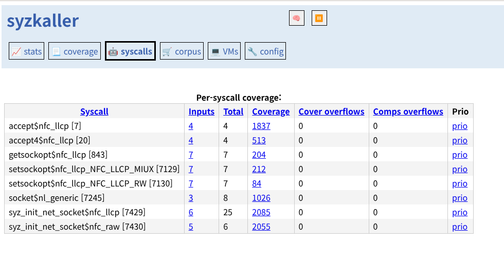 syzkaller config에 nfc 관련 syscall을 넣어서 테스트 해보자. syscall은 syzkaller 패키지 하위의 다음 파일에서 참고 하였다.