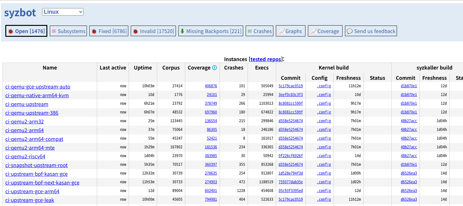 Google은 무제한 서버로 syzkaller를 돌리지만, local에서 작업하기에는 자원이 제한되어있다. syzkaller dashboard는 현재 퍼징 상태, 결과 그리고 linux subsystem에 대한 적용 범위를 표시한다.