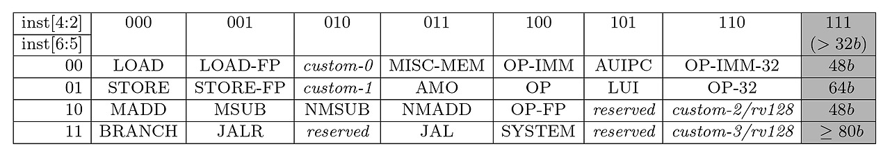 위에서 하나의 주요 opcode인 OP-IMM이 표시된 최소 5개의 다른 명령어를 포함하는 것을 볼 수 있다. 이들은 funct3 부차 opcode에 의해서만 구별되며, 정확한 매핑은 비특권 명세 문서 19장에서 볼 수 있다.